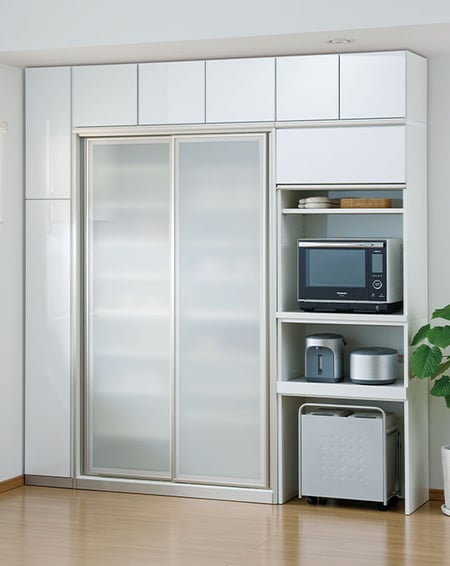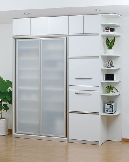 ▲ものをたくさん持っている人は、白の食器棚を選ぶのもひとつの案。すっきりと隠して、清潔感のある空間を演出できます。総幅180㎝。
